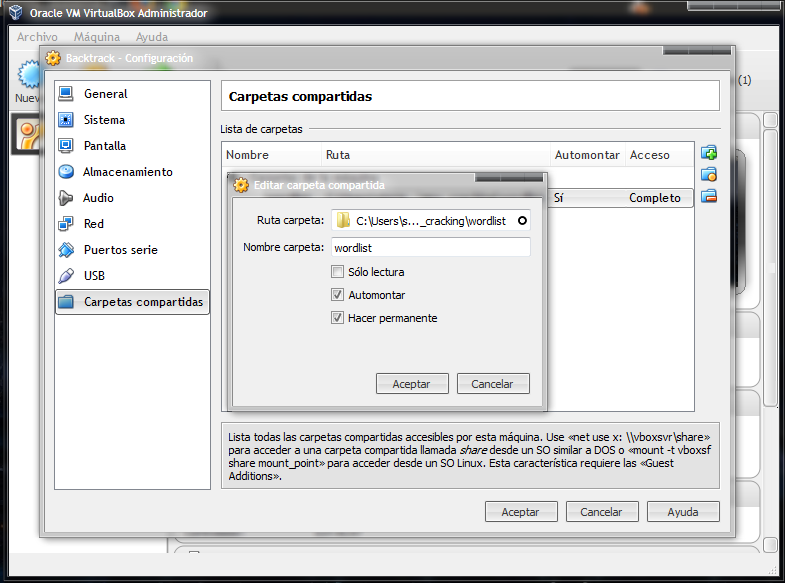Veamos como facilmente podemos compartir carpetas de windows a maquinas virtuales, en este caso backtrack 5 en virtualbox.